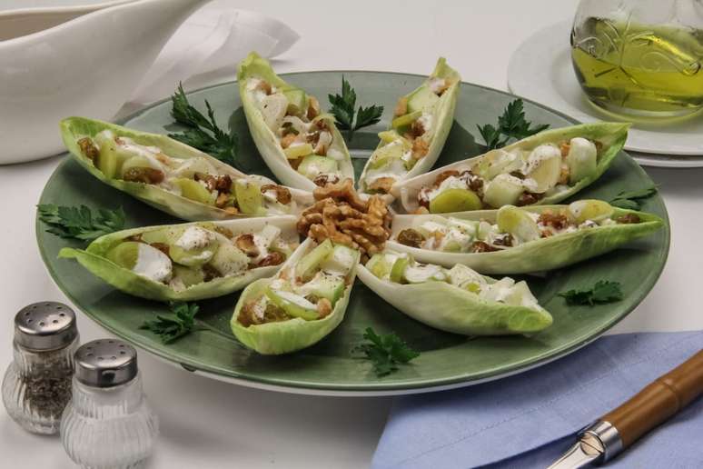 Em uma panela, aqueça o azeite em fogo médio e refogue o alho-poró por 3 minutos. Transfira para uma tigela, deixe esfriar e misture o restante dos ingredientes. Leve à geladeira por 1 hora. Divida entre as folhas de endívia e sirva em seguida.