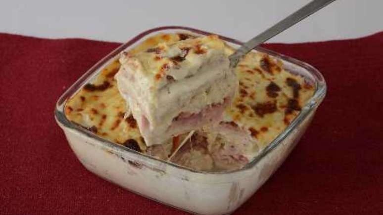 - Em um refratário médio untado, intercale camadas de pão, de molho, de presunto, de tomate e de muçarela polvilhadas com sal e orégano, terminando em pão e molho