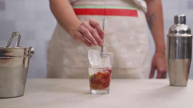 - Em um copo alto de boca larga, com um socador, macere a fruta com o açúcar