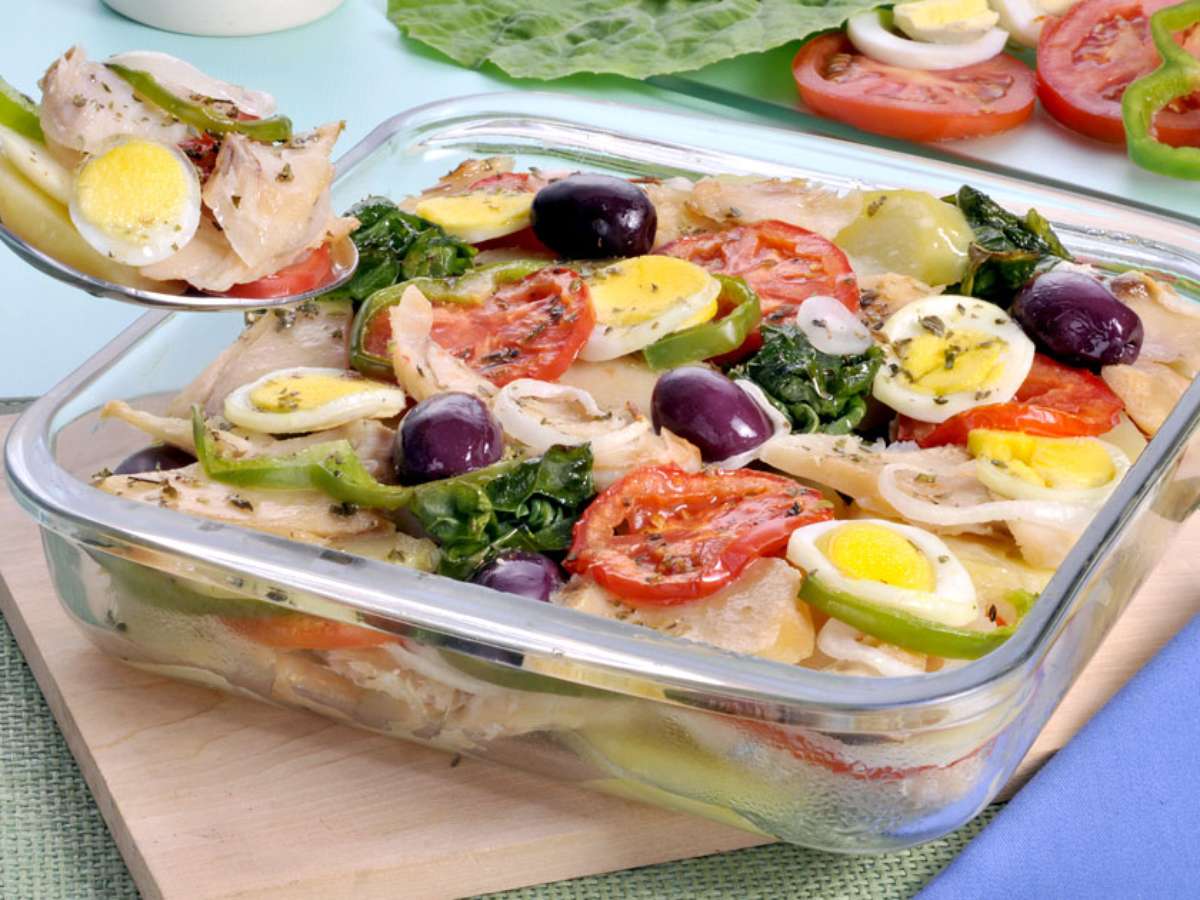 - Escorra, fatie as batatas em um refratário untado com azeite de oliva, intercale camadas de batatas, de bacalhau, de tomate, de cebola, de pimentão e de azeitonas.