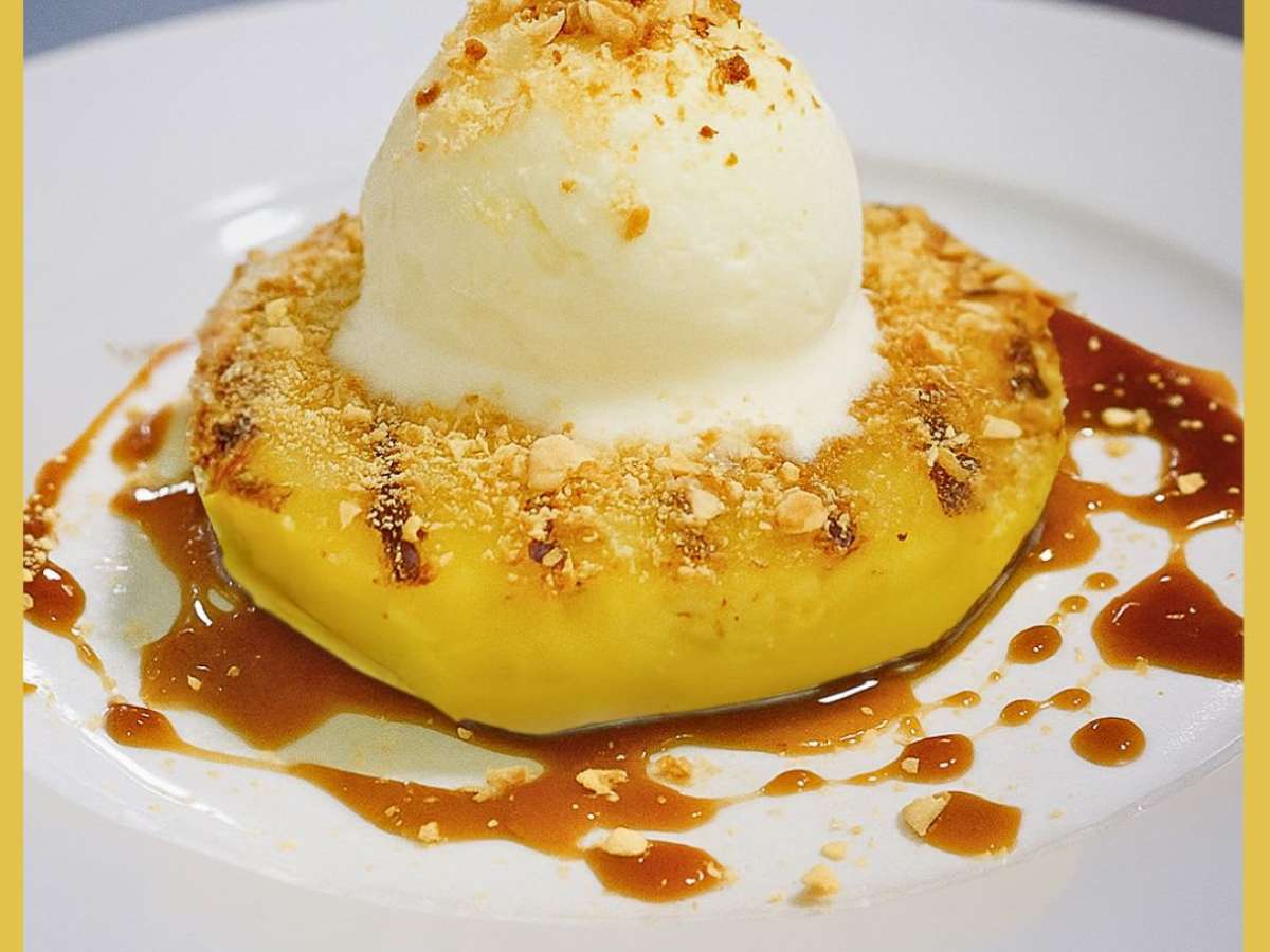 - Sirva na hora: quente (fruta), frio (sorvete), crocante (farofa) e úmido (calda).