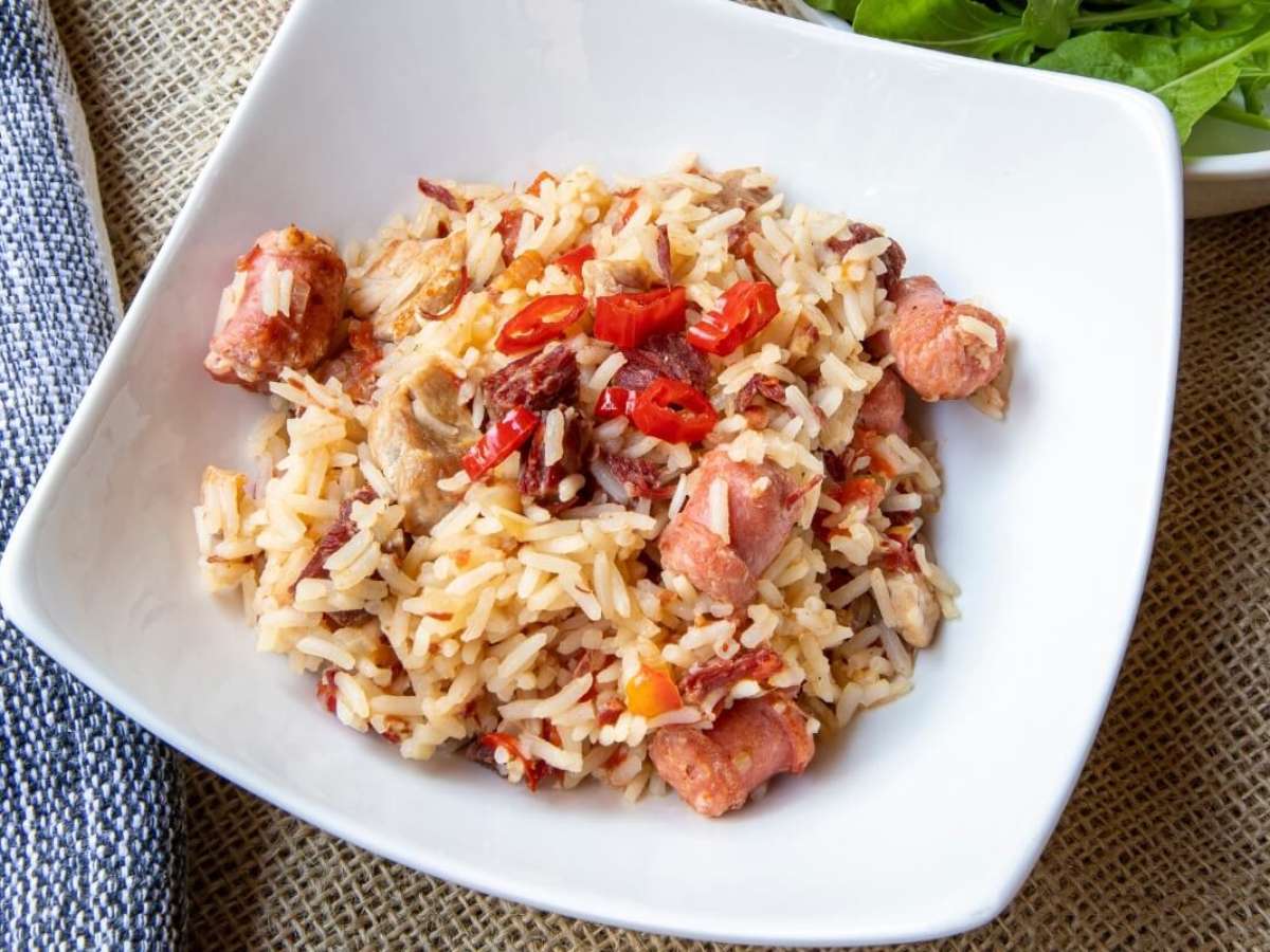 Em uma panela, coloque o óleo e leve ao fogo médio para aquecer. Adicione a cebola e o alho e doure. Junte as carnes e o tomate e refogue por 5 minutos. Acrescente o arroz e misture. Cubra com água, coloque sal e cozinhe até secar. Desligue o fogo e sirva em seguida.