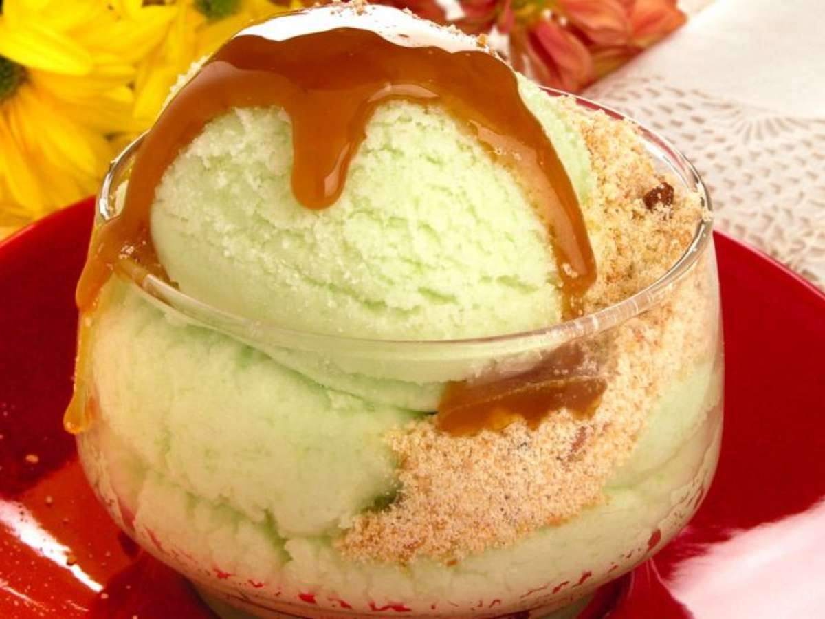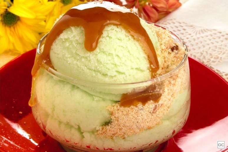 Bata na batedeira por 10 minutos e congele por mais 1 hora. Bata novamente e deixe por mais 1 hora no congelador ou até firmar. Sirva em porções coberto com a calda de caramelo e farofa doce polvilhada.