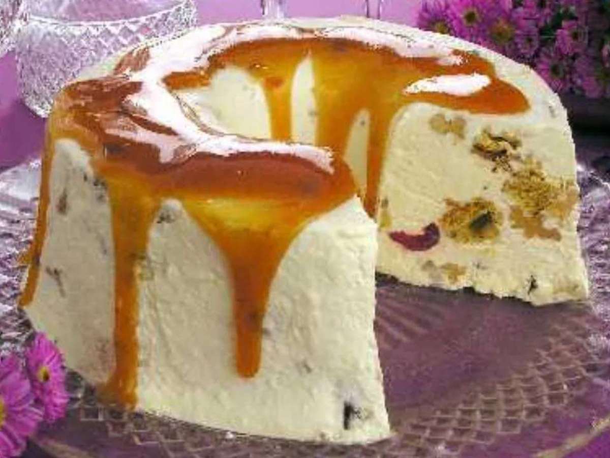 - Desenforme o sorvete passando água quente no fundo da fôrma e coloque em uma travessa.