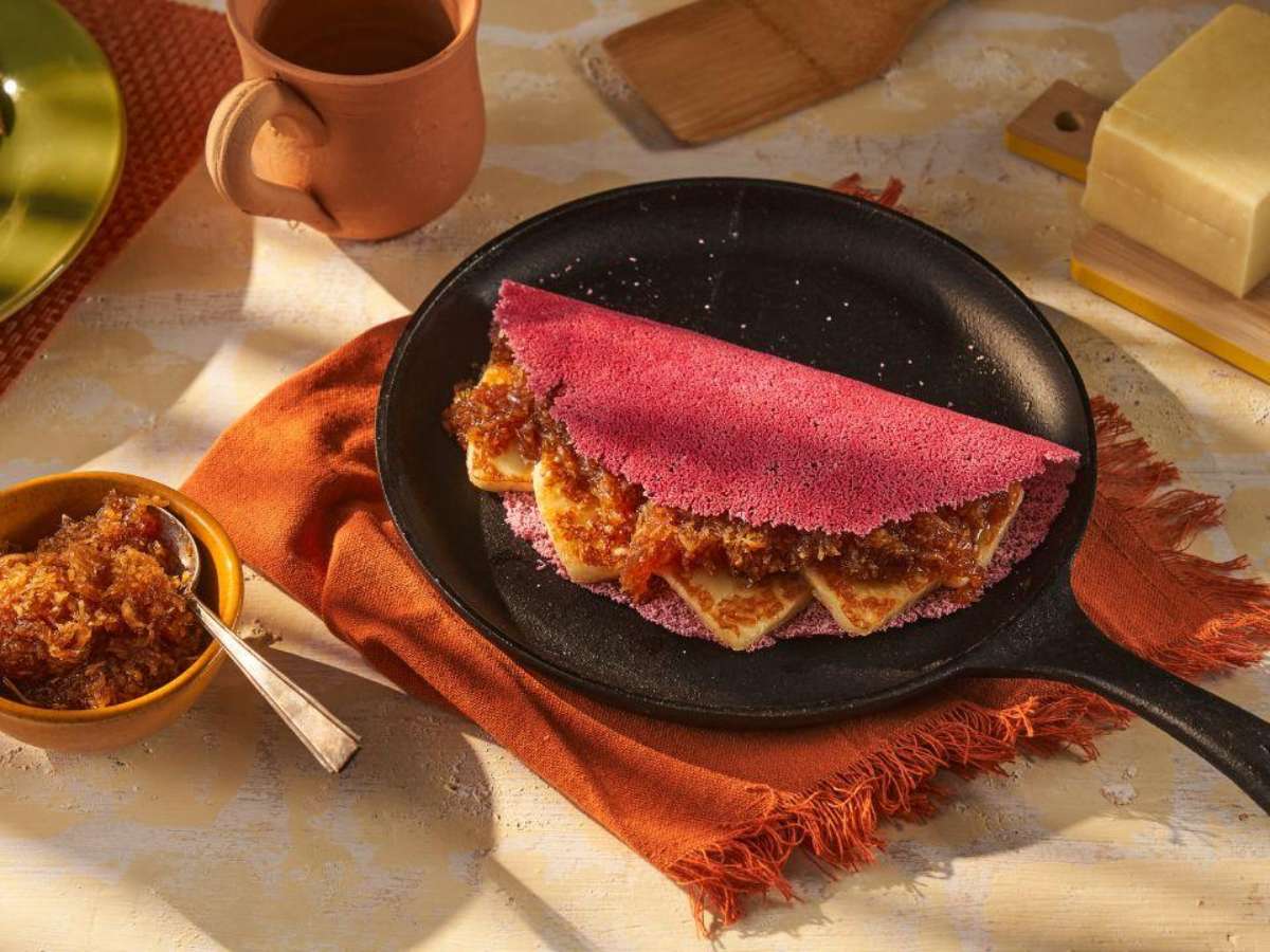 O queijo coalho dourado faz toda a diferença nesta tapioca rosa. Ele garante uma textura firme e sabor marcante.