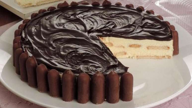 - Coloque os palitinhos de chocolate, um do lado do outro, em volta da torta, e volte à geladeira até a hora de servir.