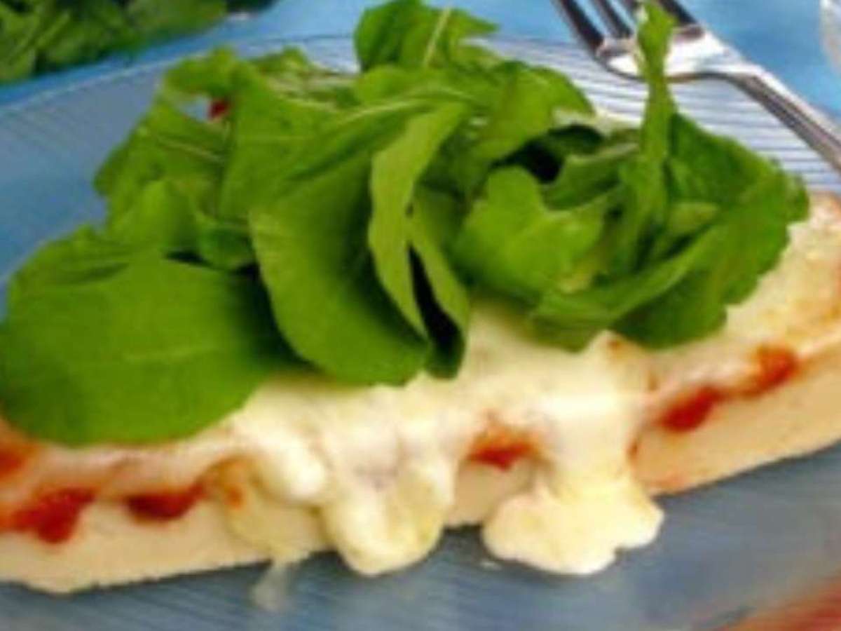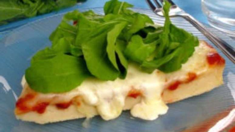 - Retorne ao forno por mais 10 minutos ou até gratinar. Retire do forno, espalhe a rúcula e sirva.