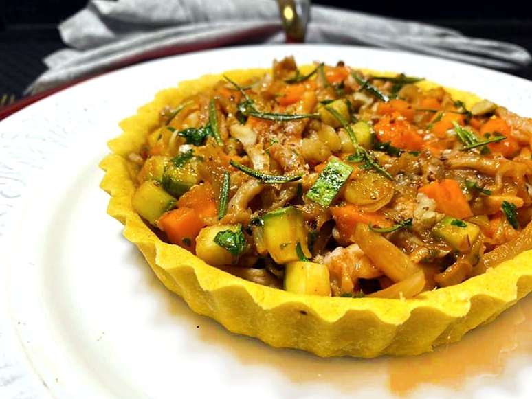2. Distribua o recheio de legumes e cogumelos bem quente por cima.