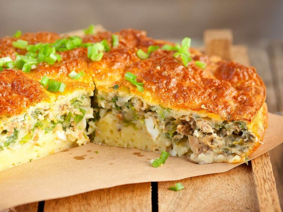 Em uma forma untada com óleo e enfarinhada com farinha de trigo, despeje metade da massa, distribua o recheio de atum com ovo e cebolinha de maneira uniforme e cubra com o restante da massa. Leve ao forno preaquecido a 180 °C por aproximadamente 35 a 45 minutos, até a superfície ficar bem dourada e firme ao toque. Retire do forno, espere amornar, desenforme e sirva em seguida.