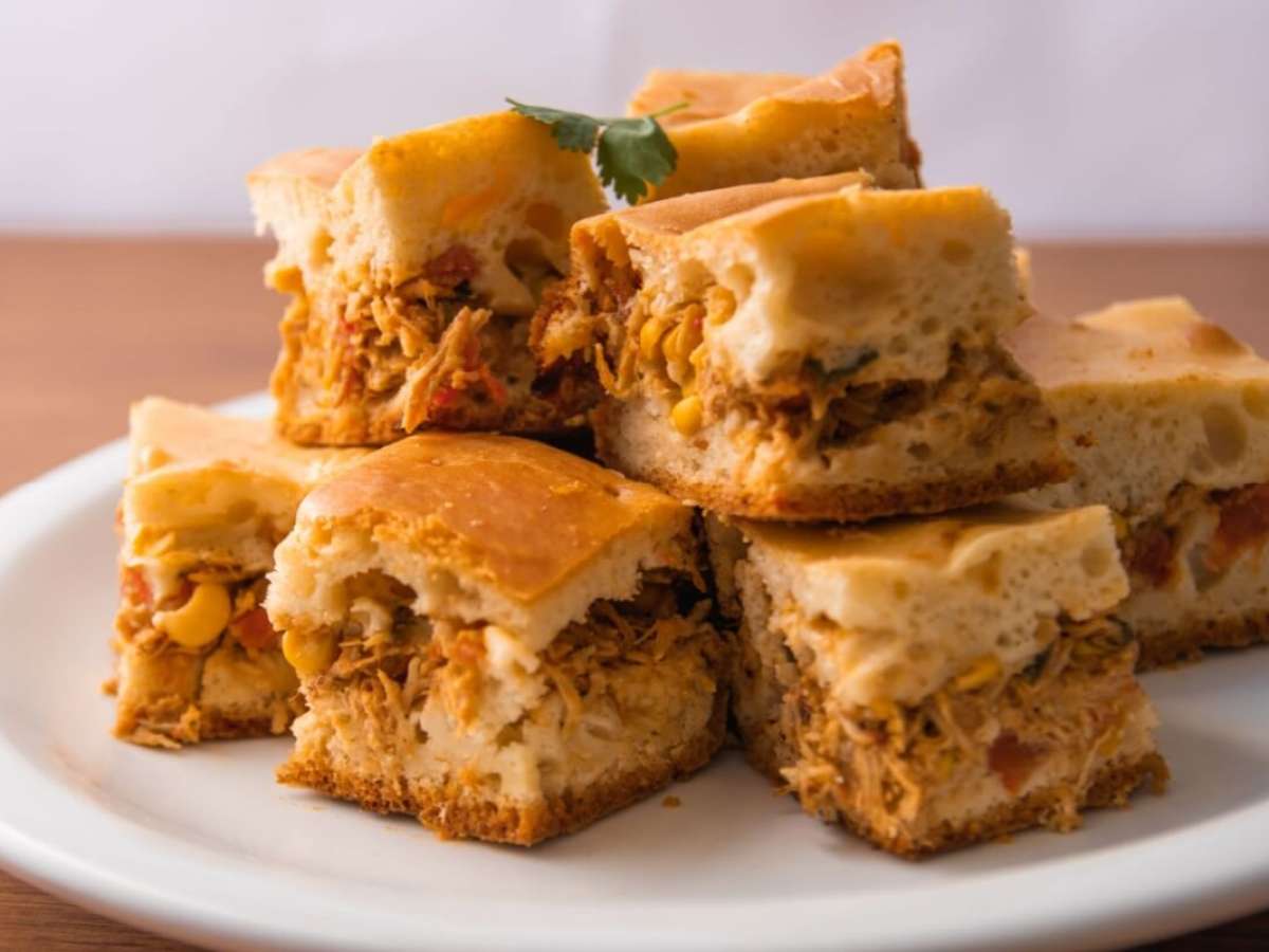 No liquidificador, bata os ovos, o iogurte, o azeite, a farinha de aveia e o sal até ficar homogêneo. Coloque a massa em um recipiente, adicione o fermento e misture com uma espátula. Misture o peito de frango, o tomate, o milho-verde e os temperos em uma tigela. Em uma forma untada com azeite e enfarinhada com farinha de aveia, despeje metade da massa. Coloque o recheio e cubra com o restante da massa. Leve ao forno preaquecido a 180 °C por 35 minutos. Sirva em seguida.