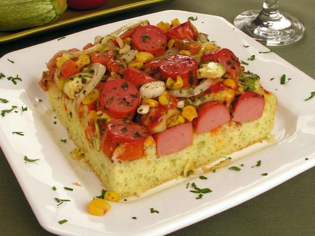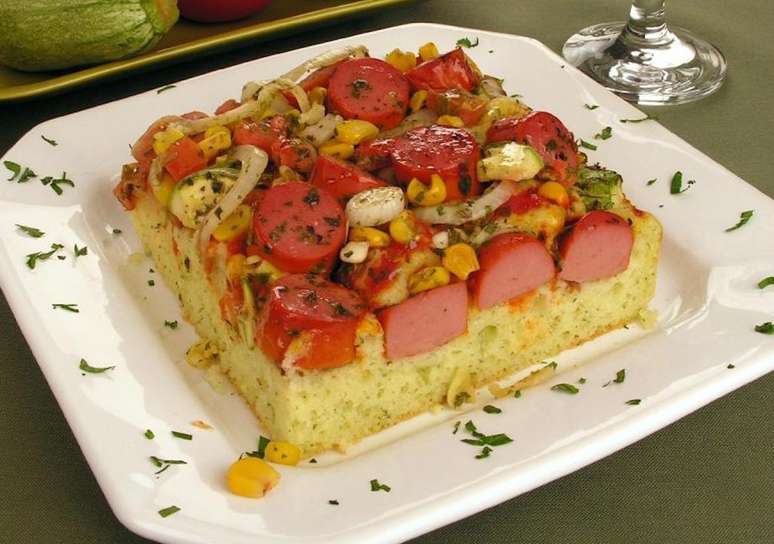 - Em uma tigela, misture a salsicha, a cebola, a salsa, o tomate, a abobrinha, o milho e tempere com orégano, sal e pimenta. Distribua esse recheio sobre a massa e leve ao forno médio, preaquecido, por 30 minutos ou até que ao enfiar um palito na massa ele saia limpo