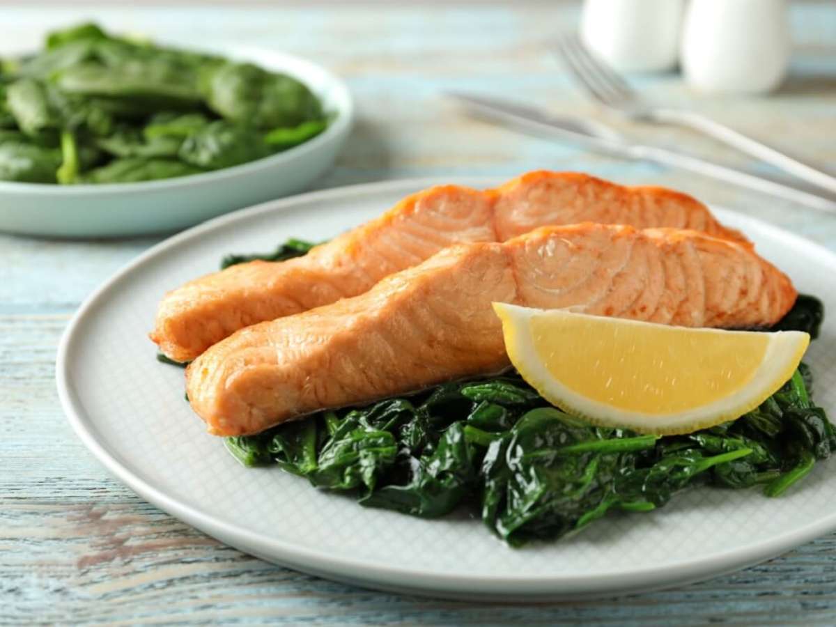 Depois, na mesma frigideira, adicione o restante do azeite e acrescente o espinafre. Refogue em fogo médio por cerca de dois minutos, mexendo suavemente, até as folhas murcharem. Tempere com sal. Sirva o salmão sobre o espinafre refogado e finalize com a fatia de limão por cima.