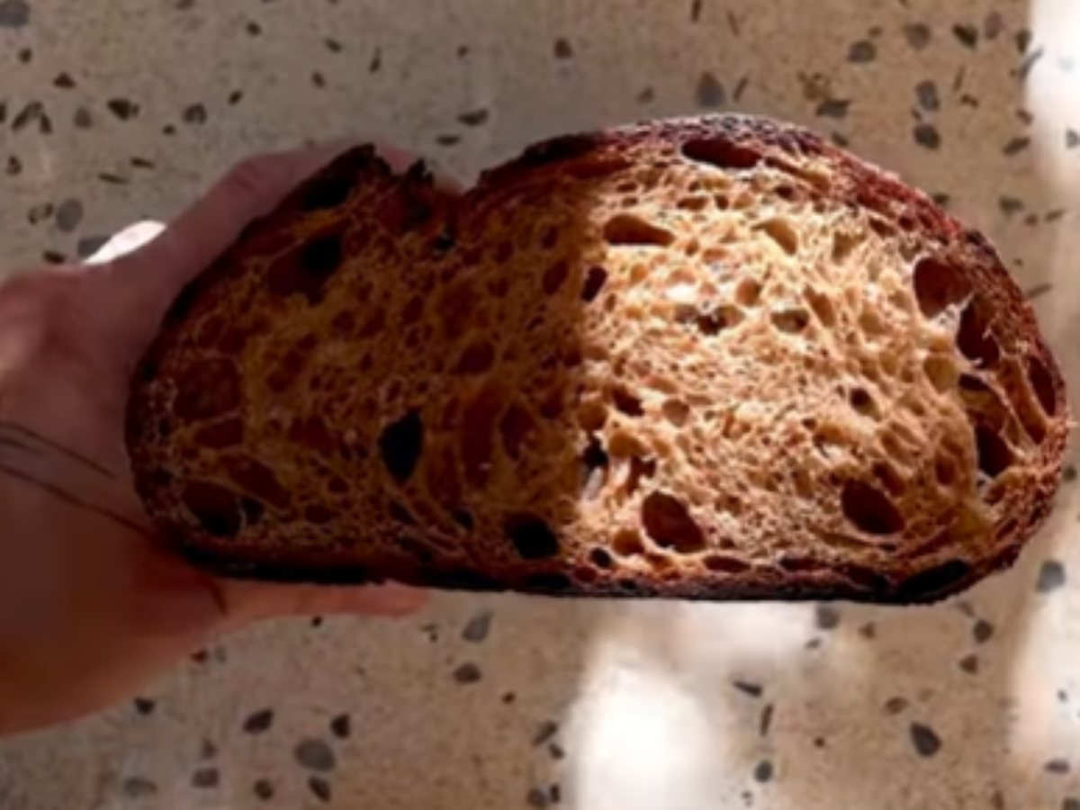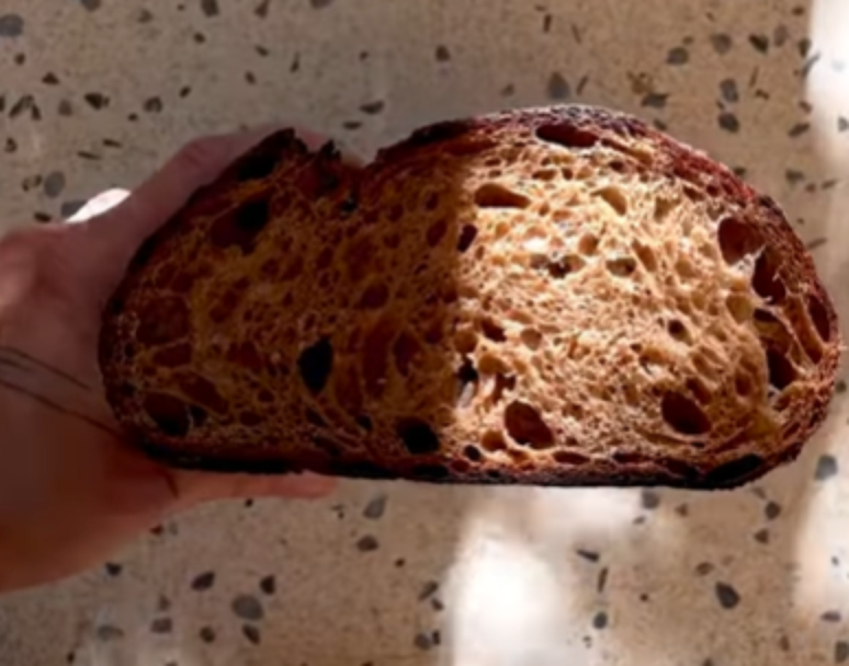 "Na primeira tentativa, mantive pedacinhos desse pão na chapa na massa, mas não deu certo, eles cristalizaram no congelador. Agora, infusiono o leite de um dia para o outro, coo e bato o sorvete. Depois, incremento essa massa com pó de pão torrado, bem torrado mesmo, ao ponto de ficar preto", revela.