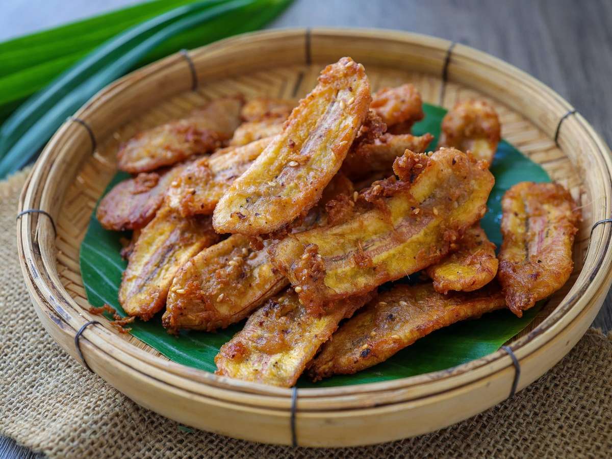O preparo começa cortando as bananas ao meio ou em rodelas mais grossas, para manter a estrutura durante o cozimento. Em seguida, é preciso empanar os pedaços para garantir a crocância.