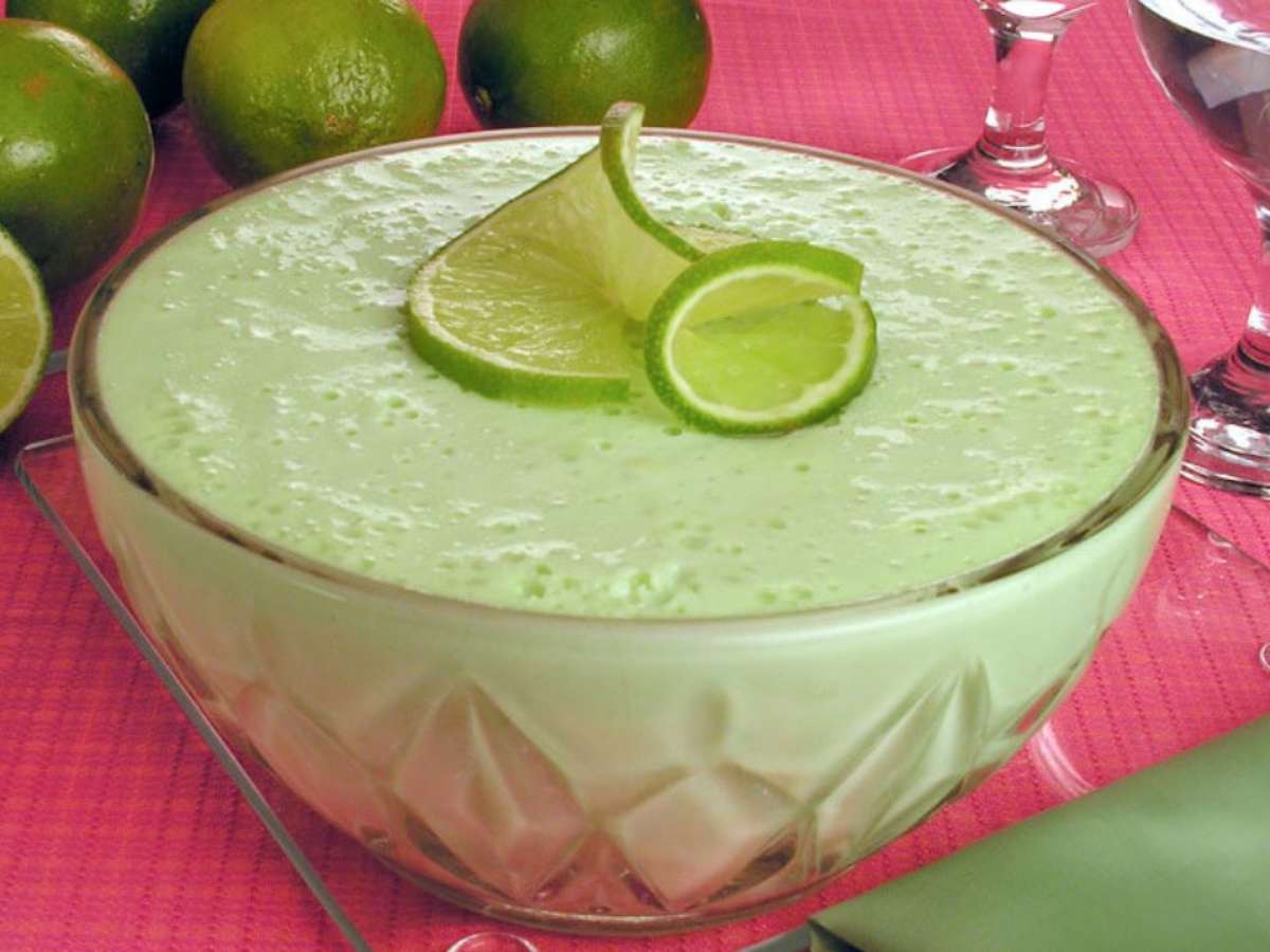 - No liquidificador, bata a gelatina de limão, a gelatina sem sabor dissolvida conforme as instruções da embalagem, o leite condensado, o suco de limão, o creme de leite e o sorvete até ficar bem cremoso