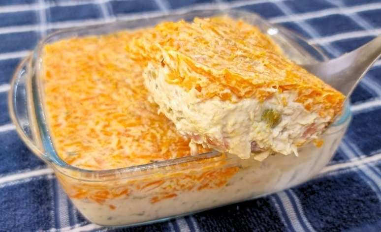 A receita é montada em duas camadas: a base leva um creme de frango, enquanto a cobertura combina cenoura cozida com iogurte natural. O rendimento é de aproximadamente quatro porções e o preparo também permite adaptações: o frango pode ser substituído por atum, sardinha ou ovo cozido picado, além da possibilidade de variar os temperos conforme a preferência.