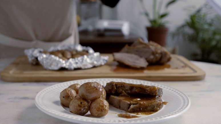 - Dispor o papelote com a carne e o papelote com as batatas na mesma forma e levar ao forno preaquecido 180 graus por 30 minutos.