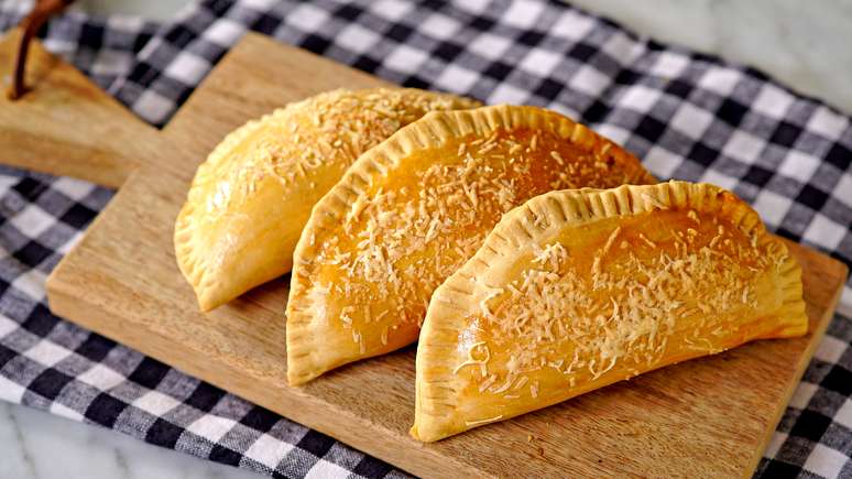 - Fechar bem a massa com auxílio de um garfo, pincelar com o ovo batido, polvilhar o parmesão ralado e levar ao forno a 200 graus por 25 minutos.