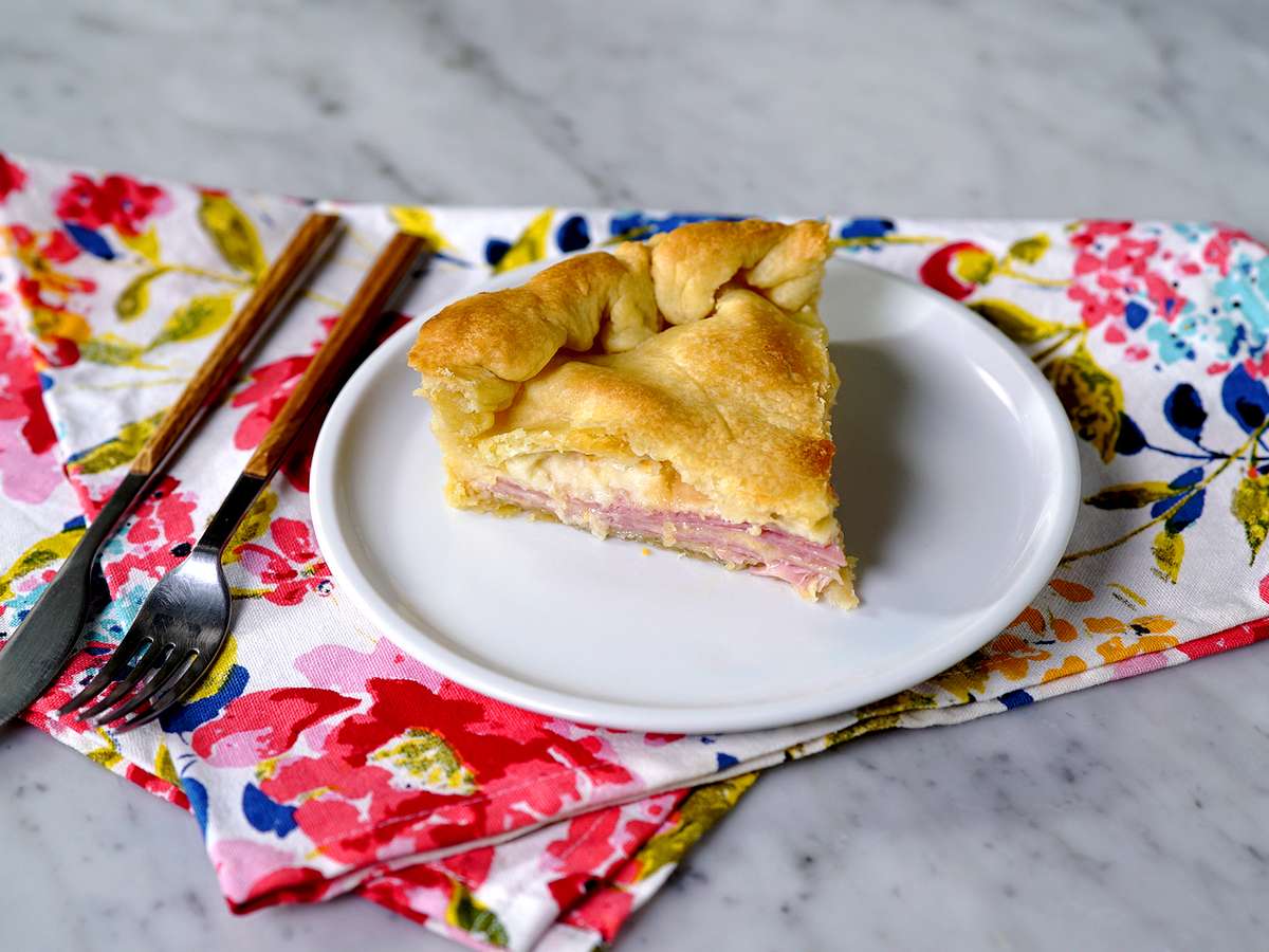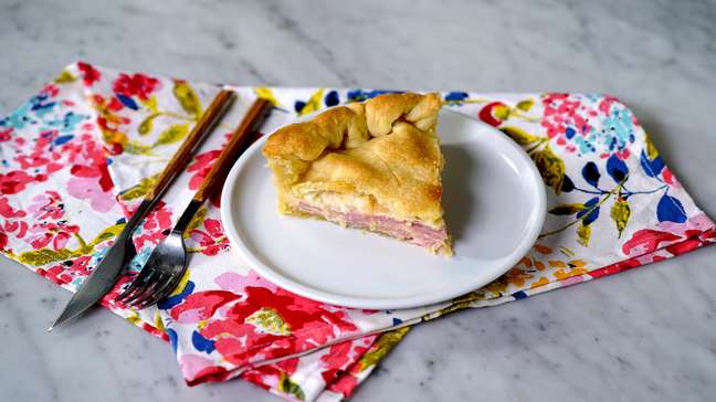 - Rechear com uma camada de queijo provolone, uma camada de presunto, uma camada de queijo muçarela, mais uma camada de presunto e uma camada de queijo parmesão ralado.