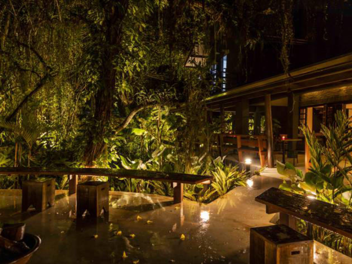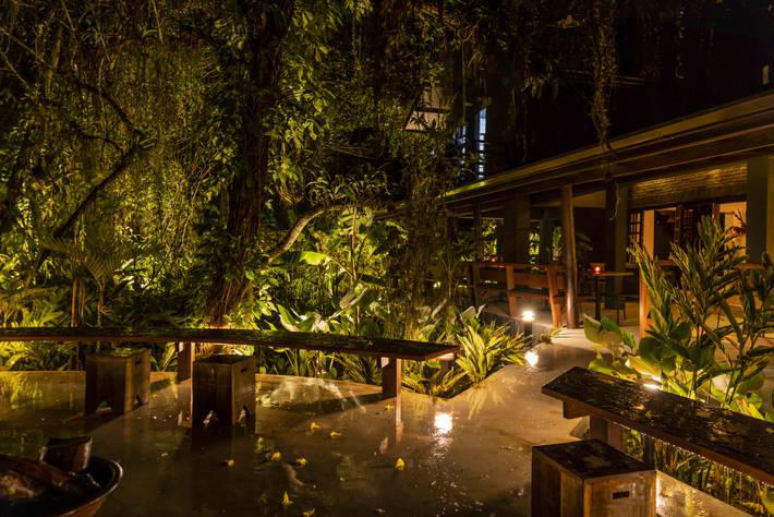 Um bar na praia, cercado pela Mata Atlântica, com boa comida e drinks