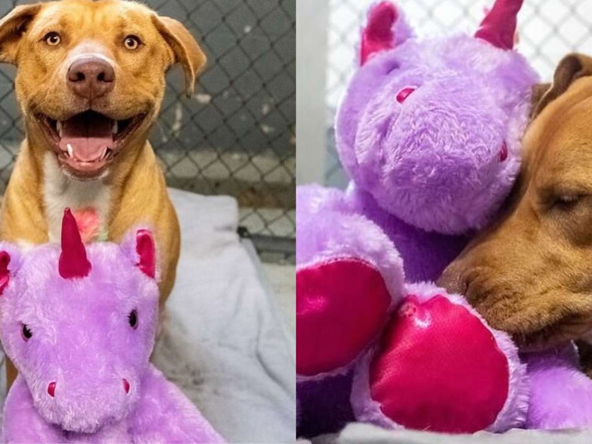 Depois de ficar apaixonado por um unicórnio de pelúcia em uma loja, cachorrinho ganha família
