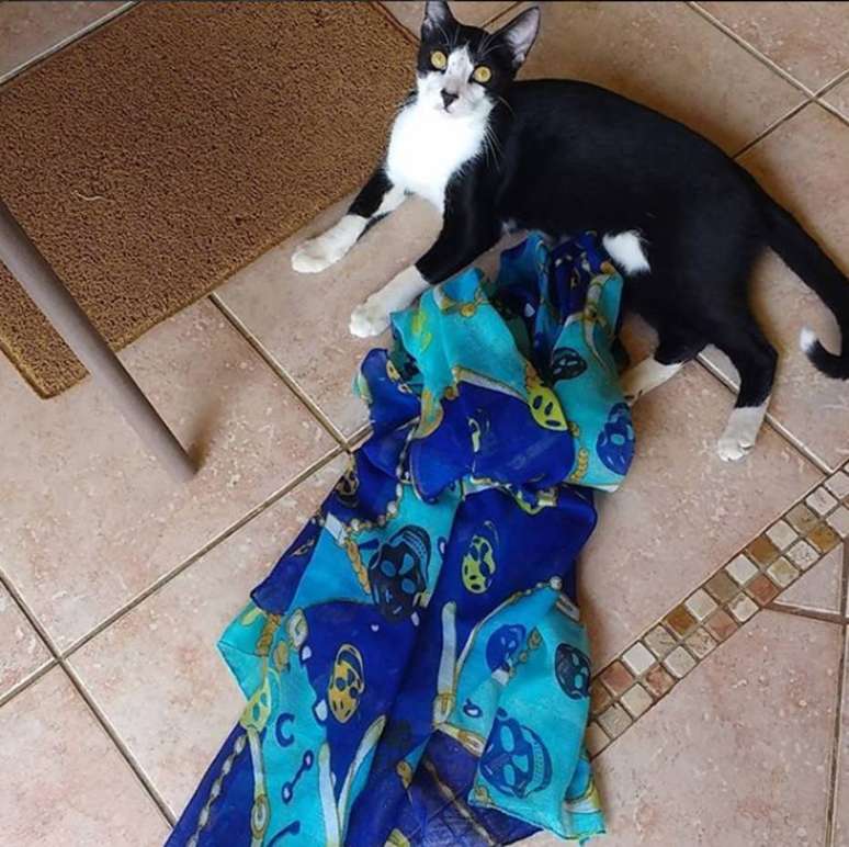 "Me perdoem, vizinhos, mas eu realmente sofro da doença do roubo, sou cleptomaníaco, mas estou super disposto a devolver tudinho. Por favor, ajudem a minha mãe a achar os donos das peças que estão expostas no meu perfil", diz a legenda de uma foto com regatas e uma cueca que o felino Back furtou.