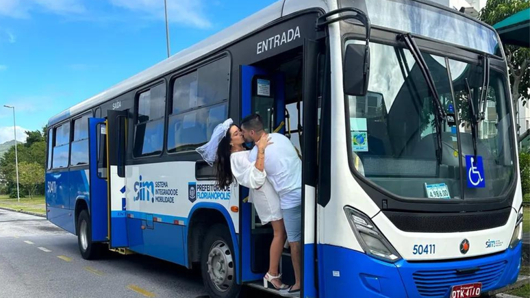 Em SC, casal escolhe terminal de ônibus para noivar e realizar chá revelação de filho