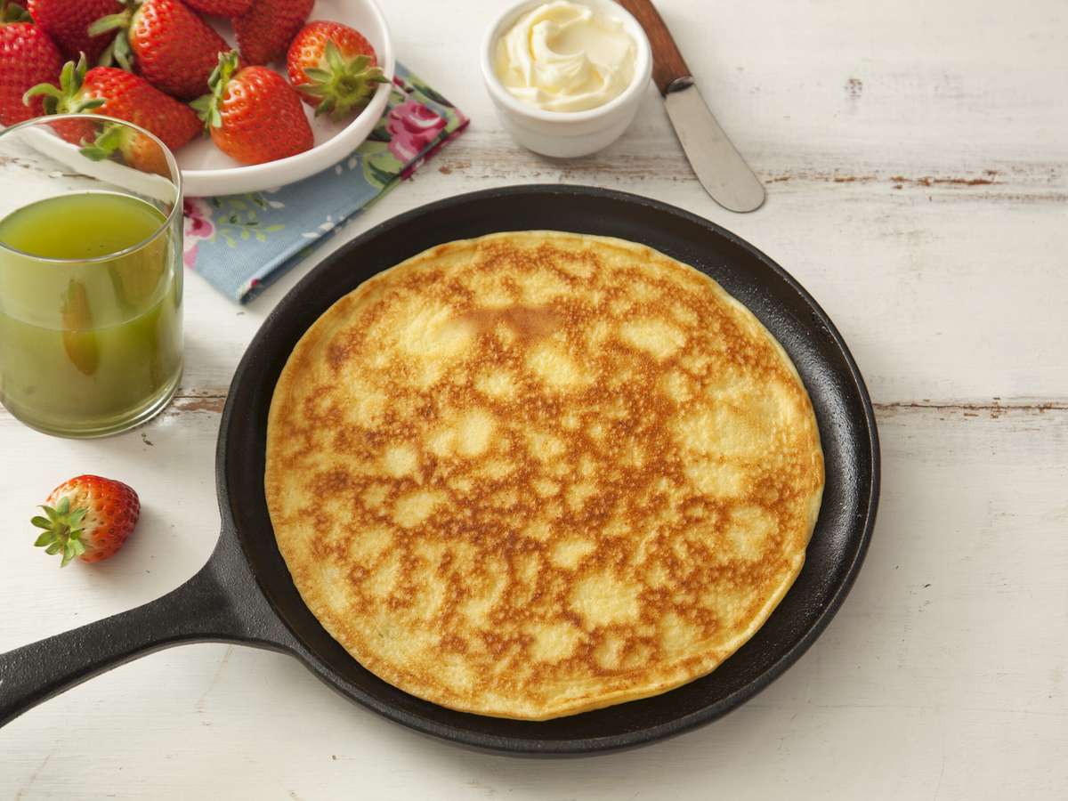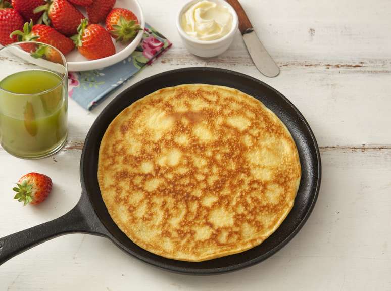 - Unte uma frigideira antiaderente, despeje a massa e deixe cozinhar por dois minutos em fogo baixo. Vire para dourar do outro lado mais um minuto.