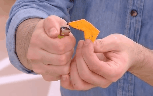 Pegue uma unidade do salgadinho e posicione o fogo do fósforo ou isqueiro com a outra diretamente no alimento. E é isso.