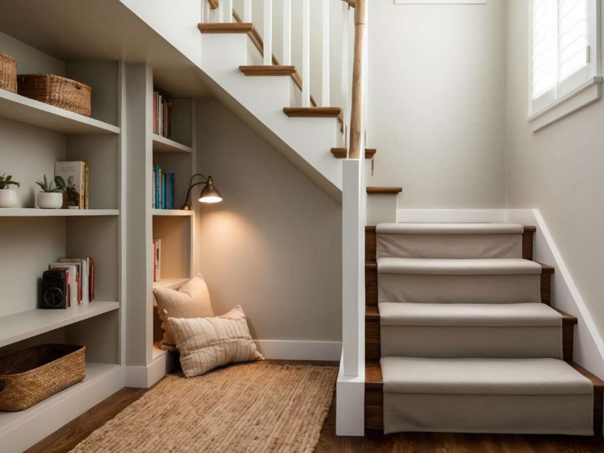 Como a parte de baixo da escada acaba sendo um espaço pouco visitado, é comum ceder à tentação de preencher esse local com aparelhos ou acessórios em desuso. Não cometa esse erro: todo tipo de entulho atrapalha o astral, configurando um mau feng shui. O vão sob a escada deve ser um local atraente e convidativo. Que tal criar um pequeno jardim com flores e pedras brancas? (pedras escuras não são aconselhadas, porque potencializam a força yin desse local; daí a sugestão de pedras brancas, que são yang). Outra opção é montar um cantinho de leitura bem charmoso, ou afixar prateleiras para posicionar enfeites graciosos, vasinhos de flores e demais objetos significativos aos moradores.