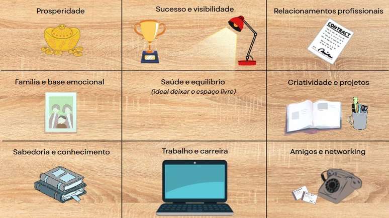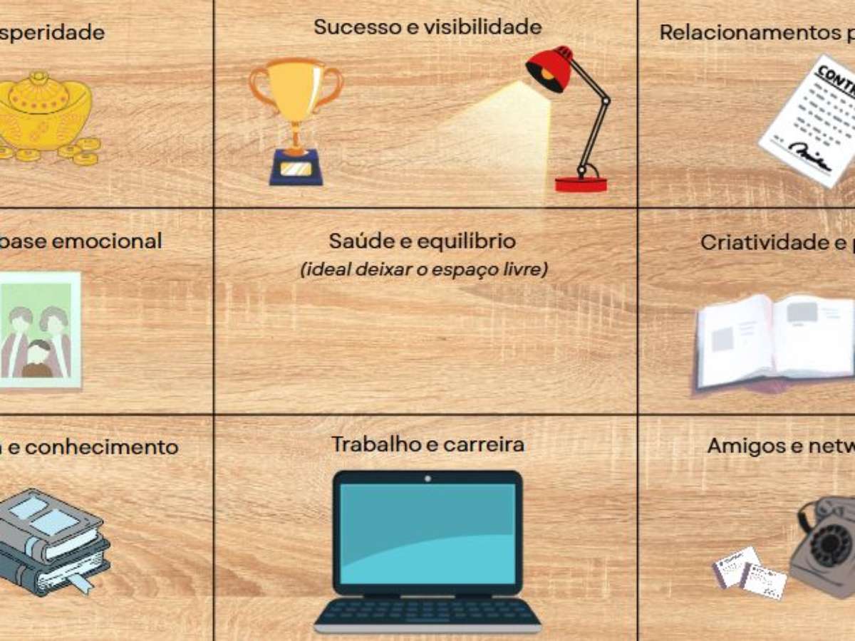 - Prosperidade (topo esquerdo): Área ligada a crescimento e reconhecimento material. Pode receber um objeto que represente metas financeiras, como um símbolo da abundância, por exemplo.