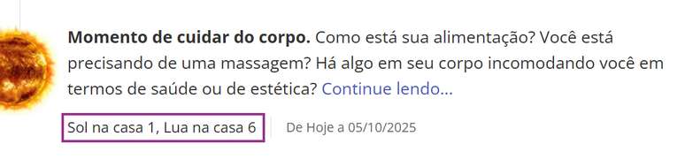 - Então, procure nos trânsitos o de "Sol na Casa…" e o de "Lua na Casa…" Na imagem abaixo, por exemplo, a pessoa está com o Sol na Casa 1 e a Lua na Casa 6.