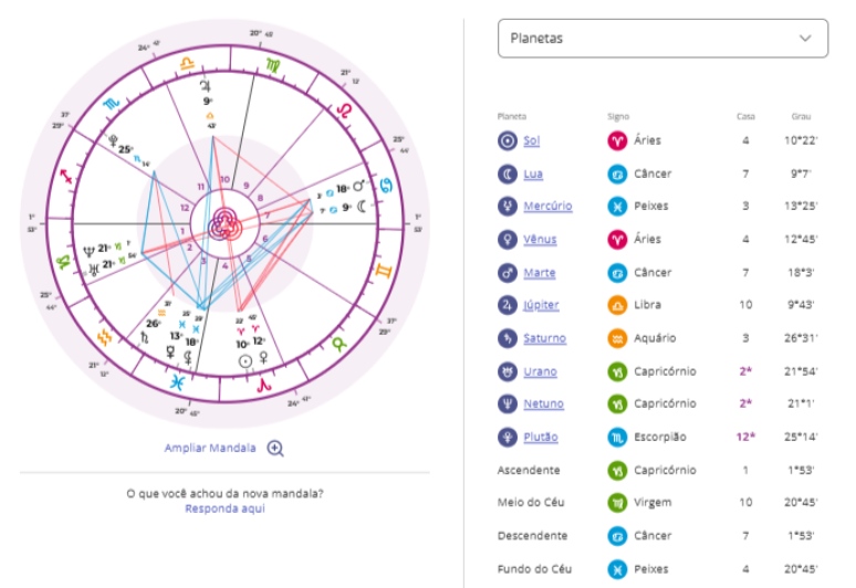 - Então, ao lado da mandala, você terá uma tabela com o seu Perfil Astrológico completo, com todos os planetas.
