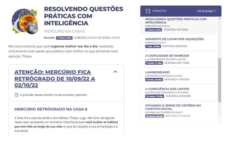 Veja que no exemplo abaixo a pessoa tem 13 trânsitos ativos (no menu que está à direita), sendo que Mercúrio está passando pela Casa 6 neste momento. Perceba que há um destaque sobre Mercúrio retrógrado à esquerda com a previsão completa e personalizada!