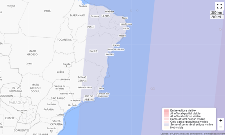 No Brasil, o momento de maior magnitude astronômica ocorreria às 17h50, mas como a Lua já estará abaixo do horizonte, não será possível ver o eclipse daqui.
