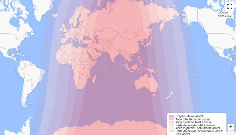 As melhores condições para observar o eclipse estarão na Ásia e na Austrália Ocidental, onde será possível acompanhar todas as fases — desde o início do eclipse parcial até o retorno total do brilho da Lua.