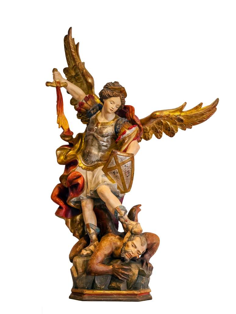 Amado e venerado, São Miguel, chefe, também reconhecido por sua vitória diante do dragão Lúcifer. Lúcifer desejou ser semelhante a Deus. Miguel, com inestimável poder e força, defende corajosamente o trono celeste. “Foi feita uma grande batalha” (Apocalipse 12) e o bem alcança a vitória.