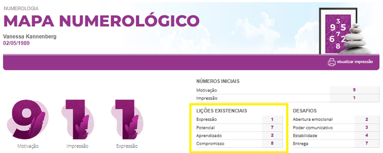 - Olhe as Lições Existenciais, bem como a Motivação e a Impressão. Os números de Expressão, Potencial, Aprendizado e Compromisso estão em destaque, como na imagem abaixo.