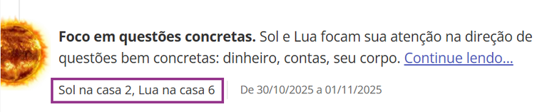 - Então, procure nos trânsitos o de "Sol na Casa…" e Lua na Casa…". Na imagem abaixo, por exemplo, a pessoa está com Sol na Casa 2 e a Lua na Casa 6.