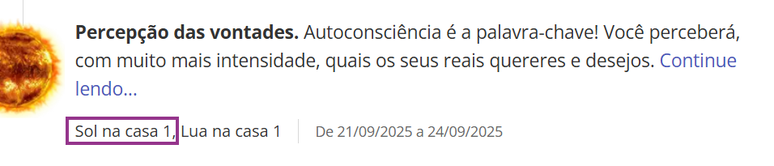- Procure pelo trânsito de "Sol na Casa…" e veja qual é o número da casa que está em destaque neste momento. Na imagem abaixo, por exemplo, a pessoa tem o Sol na Casa 1.