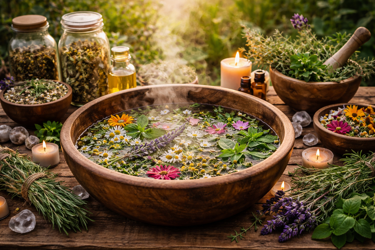 Na cosmologia dos terreiros e na sabedoria dos antigos, as ervas são as veias da terra, carregadas de puro axé. O banho de ervas não é apenas uma higiene do corpo, mas uma lavagem da alma. Quando as propriedades medicinais e vibracionais das plantas tocam a nossa pele, ocorre uma troca: as ervas absorvem nossas densidades e nos entregam sua vitalidade solar. Tomar um banho de ervas é, essencialmente, batizar-se de novo na força da criação.