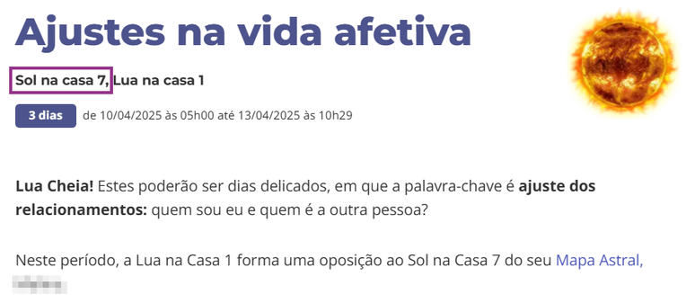 - Então, procure nos trânsitos o de "Sol na Casa…". Na imagem abaixo, por exemplo, a pessoa está com o Sol na Casa 7.
