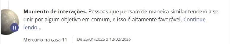 - Procure na lista por Mercúrio. Vai aparecer "Mercúrio na Casa…", como no exemplo abaixo, em que está na Casa 11.