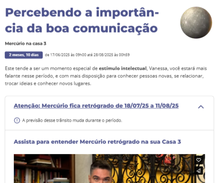 Ao clicar nesse trânsito, você encontra o destaque completo com o significado da retrogradação para a sua vida — com vídeo e conselhos práticos, como mostra a imagem a seguir: