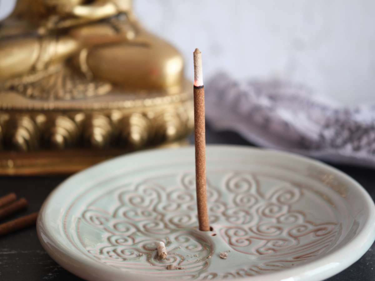 2. Com o ambiente preparado, acenda o incenso e coloque-o sobre o pires. Enquanto a fumaça sobe, imagine seus pensamentos se organizando. Além disso, tente perceber como o aroma já começa a relaxar o corpo.