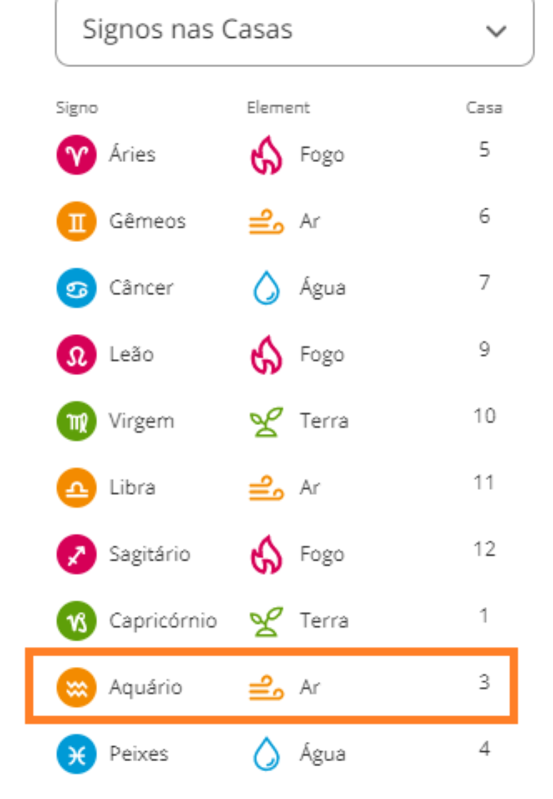 - Na imagem abaixo, você pode ver um exemplo. A pessoa que tem esse Mapa, tem Aquário na Casa 3: