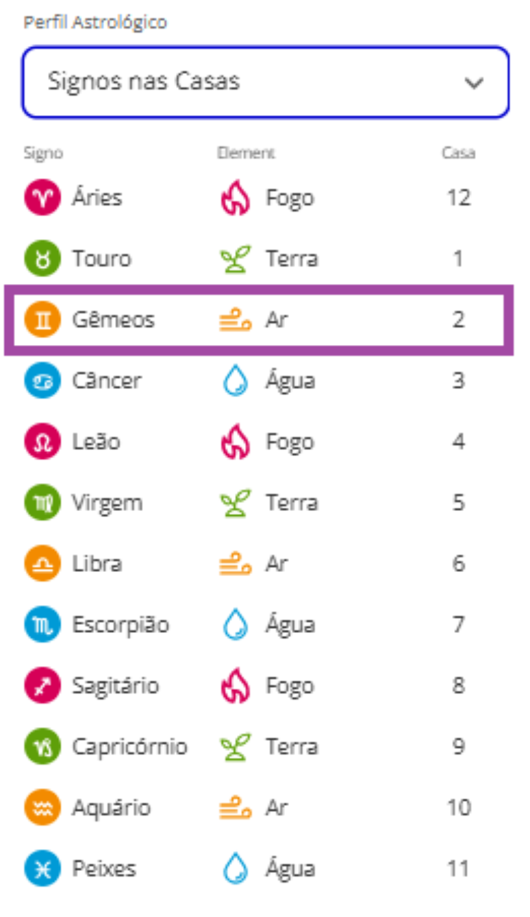 Na imagem abaixo, perceba que a pessoa tem Gêmeos na Casa 2: