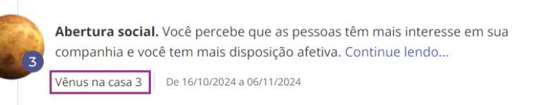 - Então, veja a lista de Trânsitos, em qual casa Vênus estará. No exemplo abaixo, que a pessoa estará com Vênus na Casa 3.