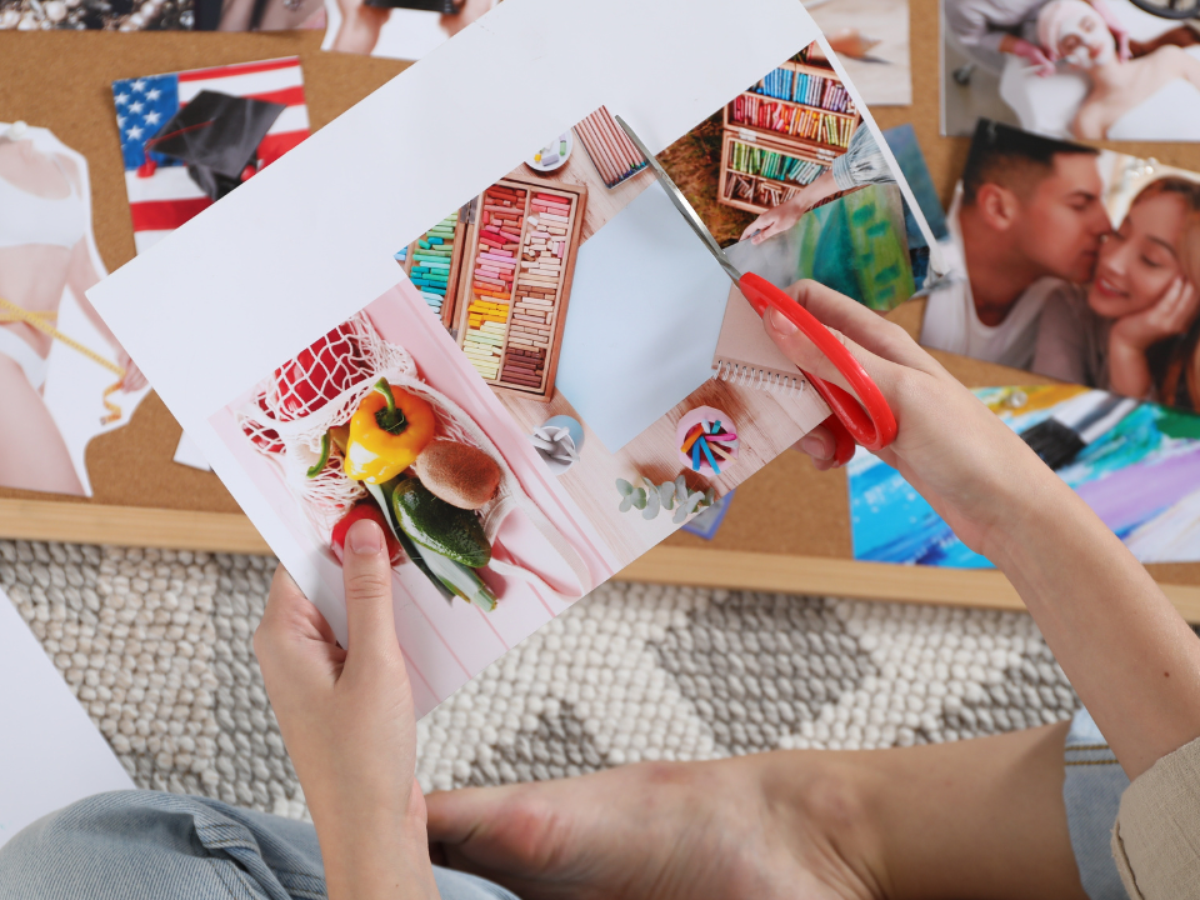 Corte imagens que representem seus desejos. Pode ser uma viagem, um relacionamento feliz, uma carreira de sucesso, não há limites! Em seguida, escreva frases que tragam foco e positividade para as metas.