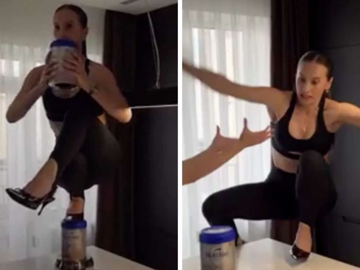 O vídeo do desafio foi postado por Mariana em suas redes sociais. Nas imagens, ela aparece com sapatos de salto alto tentando fazer agachamento sobre um pote de fórmula para bebês. Mas a russa escorregou, e a brincadeira terminou no hospital.